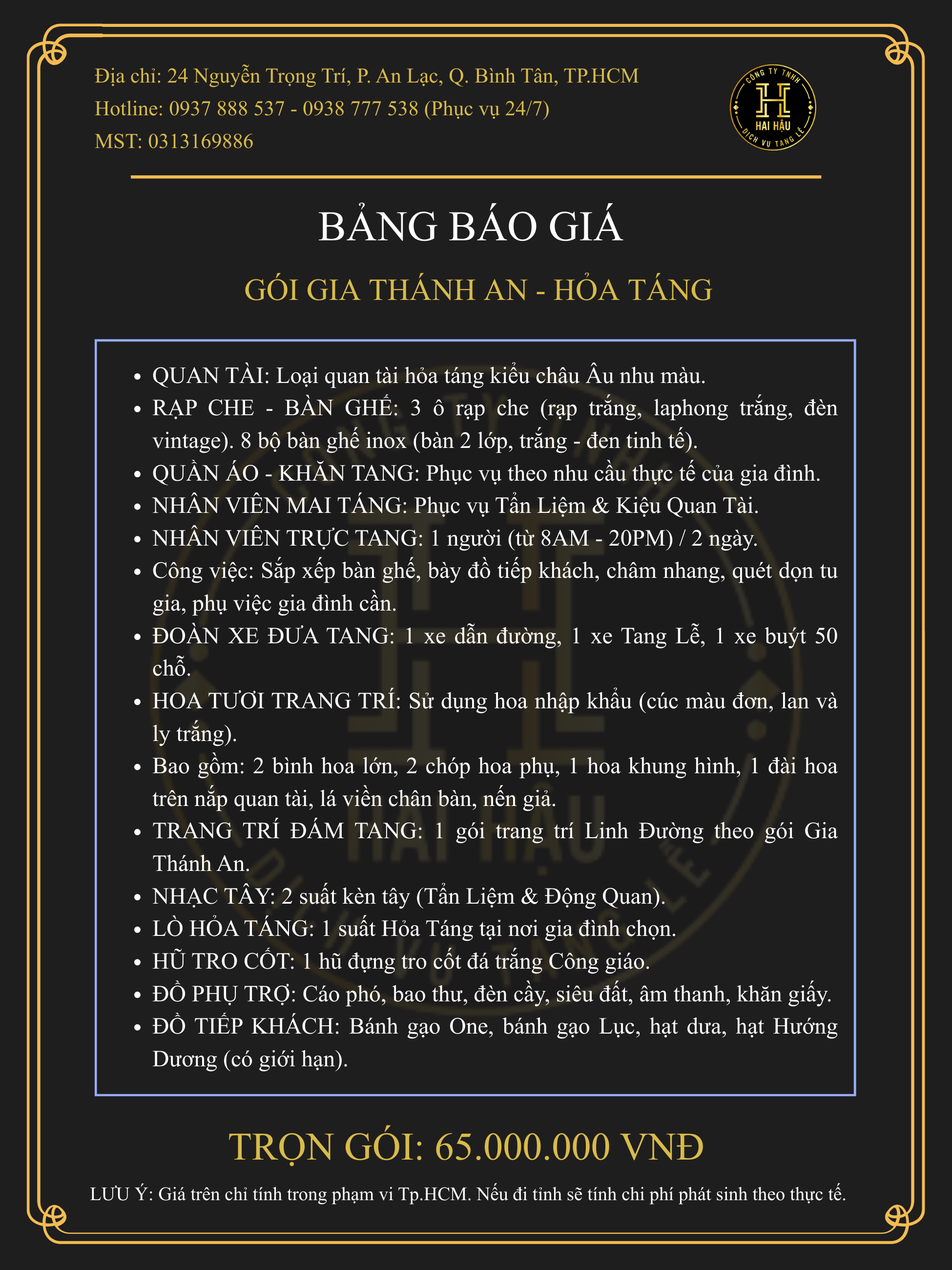 Gói Gia Thánh An là sự lựa chọn cao cấp nhất, thể hiện lòng thành kính và sự tôn vinh tuyệt đối đối với người đã khuất theo đức tin Công Giáo. Với mức giá Hỏa Táng và An Táng, gói này sử dụng những vật phẩm và dịch vụ cao cấp nhất, từ quan tài gỗ quý, xe tang sang trọng đến đội ngũ nhân sự chuyên biệt. Gói đảm bảo một lễ tang uy nghi, chu đáo đến từng chi tiết nhỏ nhất (Gia Thánh An), mang lại sự an tâm tuyệt đối cho gia quyến.